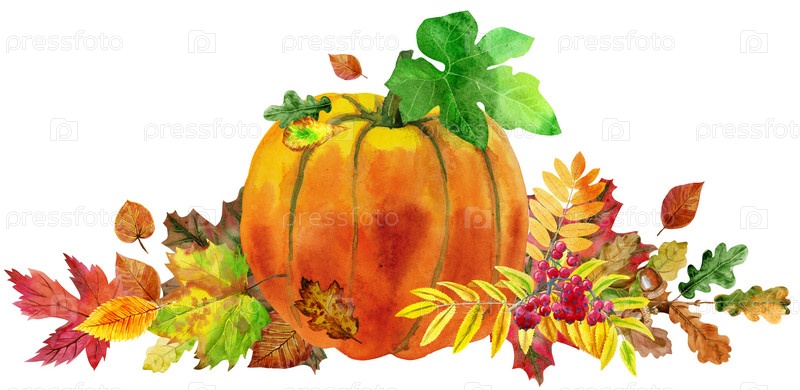 Осенние листья с тыквой на белом фоне, осенний урожай