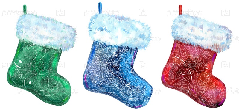 Рождественские красочные узорчатые носки для подарков на белом фоне. Акварель рисованной иллюстрации
