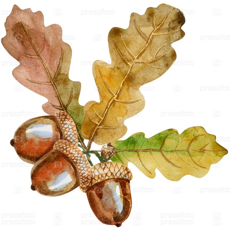 Акварель дубовые листья, ветки и желуди. Ручная иллюстрация