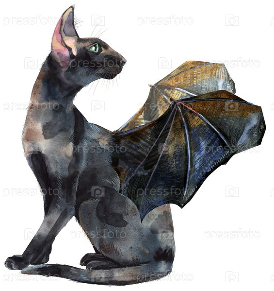 Акварельный кот с крыльями летучей мыши. Ручной обращается черный короткошерстный питомец на белом фоне