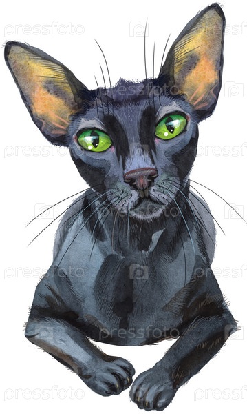 Восточная кошка акварелью. Ручной обращается черный короткошерстный питомец на белом фоне