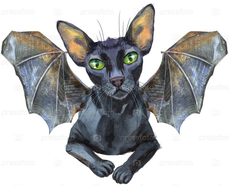 Акварельный кот с крыльями летучей мыши. Ручной обращается черный короткошерстный питомец на белом фоне