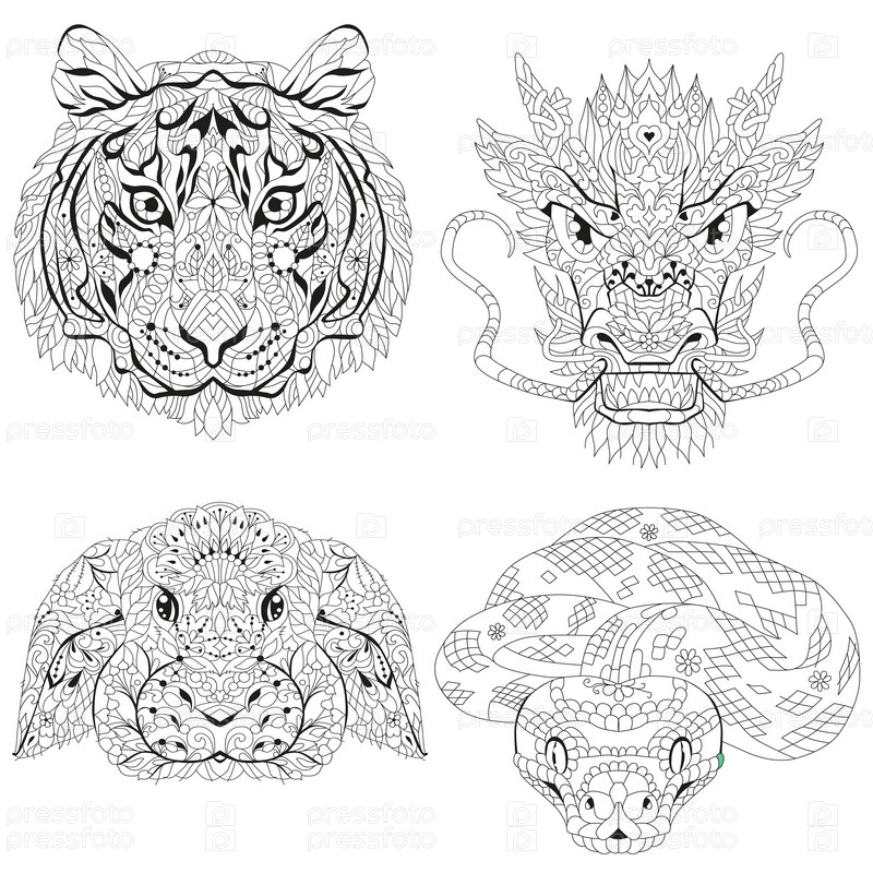 Голова тигра, дракона, кролика и голова змеи.Zentangle стилизован для дизайна футболок, татуировок и других украшений