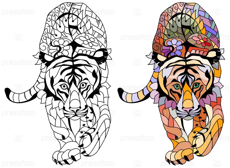 Тигр зентагле стилизованный, векторный, иллюстрационный, рисованный. печать для футболок и украшений