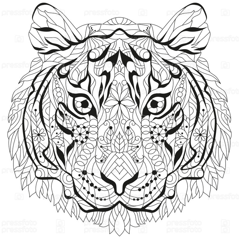 Голова тигра в стиле зентангл, стилизованная под дизайн футболки, раскраску, татуировку и другие украшения