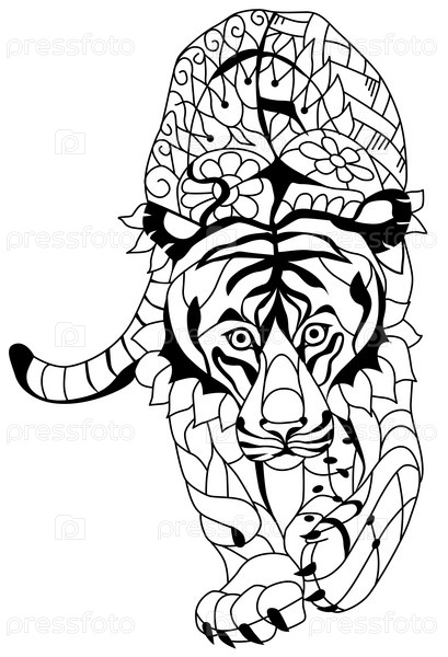 Тигр в стиле зентангл для дизайна футболок, раскраски, татуировки и других украшений