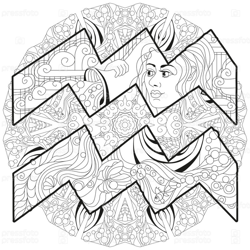Знак зодиака Водолей с мандалой, астрологический концепт-арт для окраски. Дизайн татуировки. Для окраски
