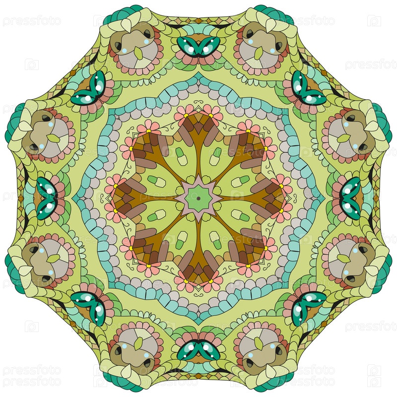 Декоративные круглые украшения. Необычная форма цветка. Восточный вектор, схемы антистрессовой терапии. Переплетение элементов дизайна. Вектор логотипов йоги