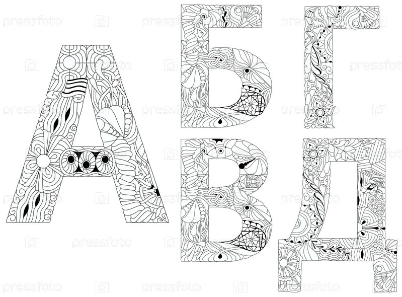 Ручной рисунок русской кириллицы букв. Зентангл алфавит. Векторная иллюстрация. Часть 1 для окрашивания