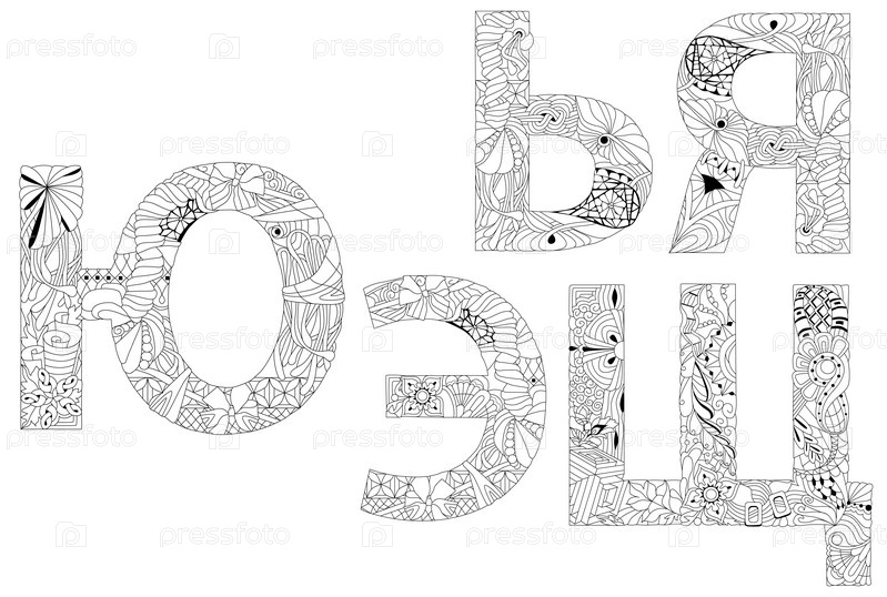 Ручной рисунок русской кириллицы букв. Зентангл алфавит. Векторная иллюстрация. Часть 6 для окраски