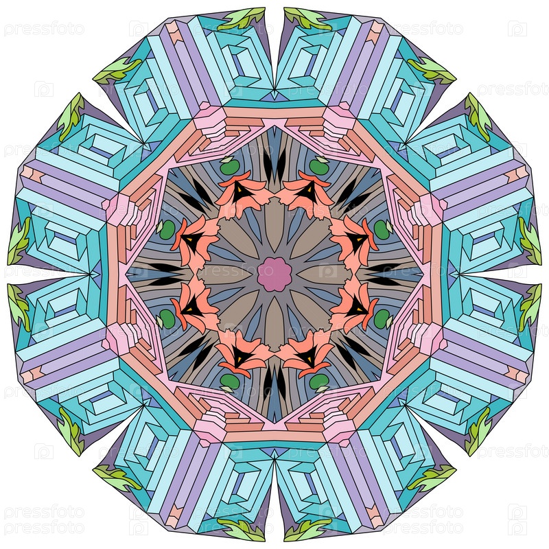 Декоративные круглые украшения. Необычная форма цветка. Восточный вектор, схемы антистрессовой терапии. Переплетение элементов дизайна. Вектор логотипов йоги