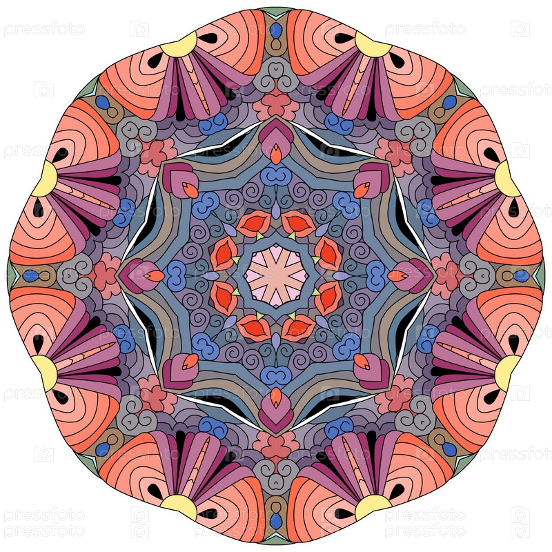 Декоративные круглые украшения. Необычная форма цветка. Восточный вектор, схемы антистрессовой терапии. Переплетение элементов дизайна. Вектор логотипов йоги