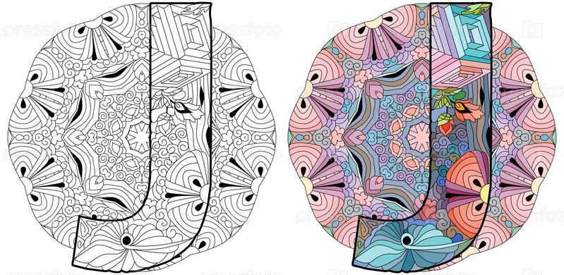 Монограмма буквы J на мандале, дизайн гравюры. Векторная иллюстрация для покраски страницы. Набор цветов и контуров