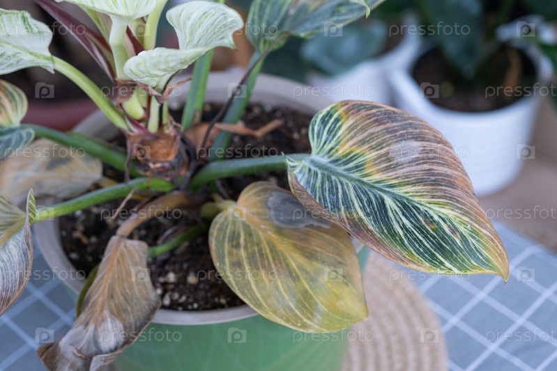 Проблемы при выращивании домашних растений Филодендрон Биркин - пораженные паутинным клещом листья, желтые и сухие кончики, перелив растения, загнивание корней. Обработка растений и борьба с вредителями и грибками