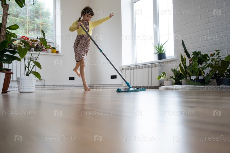 Девушка танцует со шваброй, чтобы мыть пол в новом доме - генеральная уборка в пустой комнате, радость от переезда, помощь по хозяйству