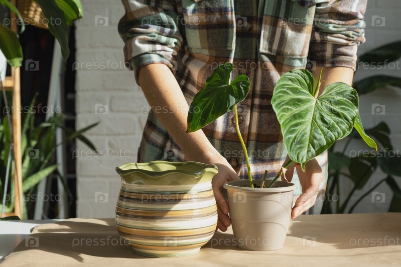 Пересадка домашнего растения Philodendron verrucosum в новый горшок большего размера в интерьере дома.Уход за растением в горшке, руки крупным планом