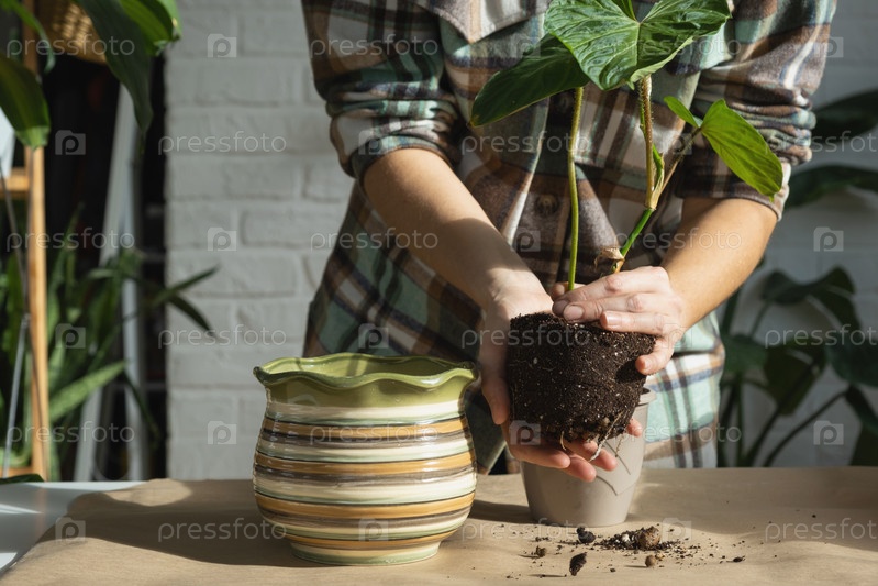 Пересадка домашнего растения Philodendron verrucosum в новый горшок большего размера в интерьере дома.Уход за растением в горшке, руки крупным планом