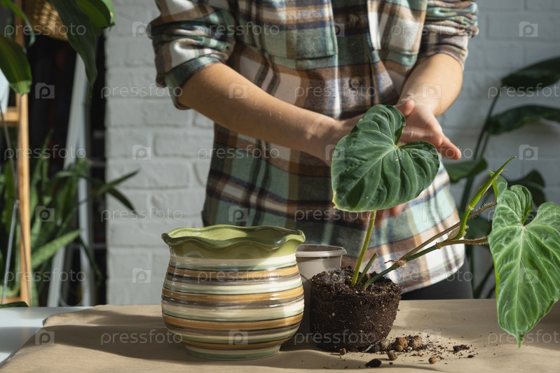 Пересадка домашнего растения Philodendron verrucosum в новый горшок большего размера в интерьере дома.Уход за растением в горшке, руки крупным планом