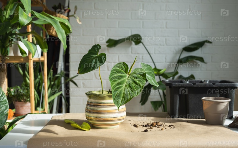 Пересадка домашнего растения Philodendron verrucosum в новый горшок большего размера в интерьере дома.Уход за растением в горшке, руки крупным планом
