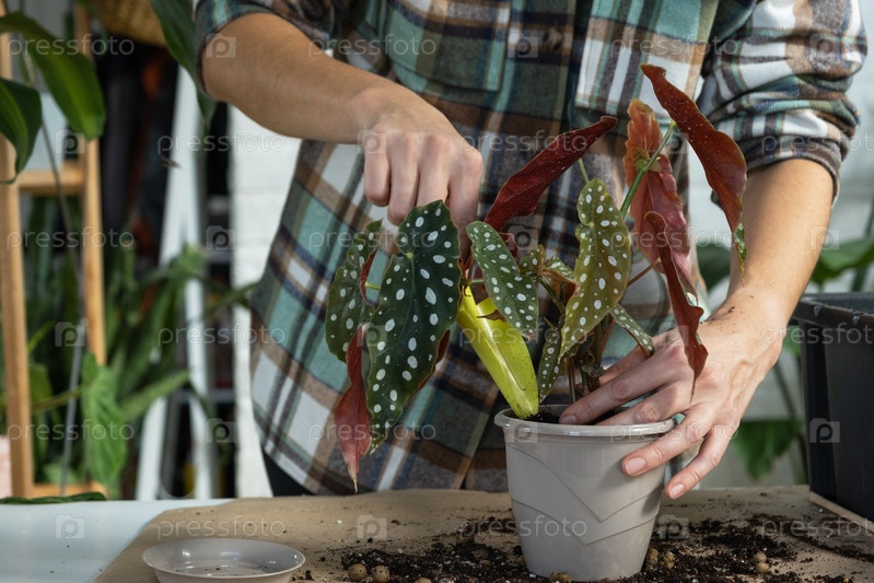 Пересадка домашнего растения Бегония пятнистая в горшок с мордочкой. Женщина сажает стебель с корнями в новую почву. Уход за растением в горшке, руки крупным планом