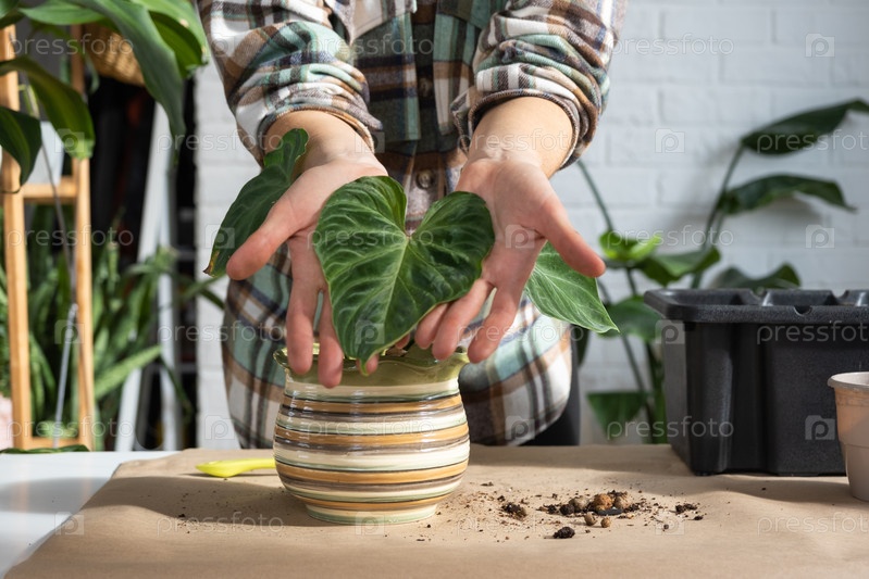 Пересадка домашнего растения Philodendron verrucosum в новый горшок большего размера в интерьере дома.Уход за растением в горшке, руки крупным планом