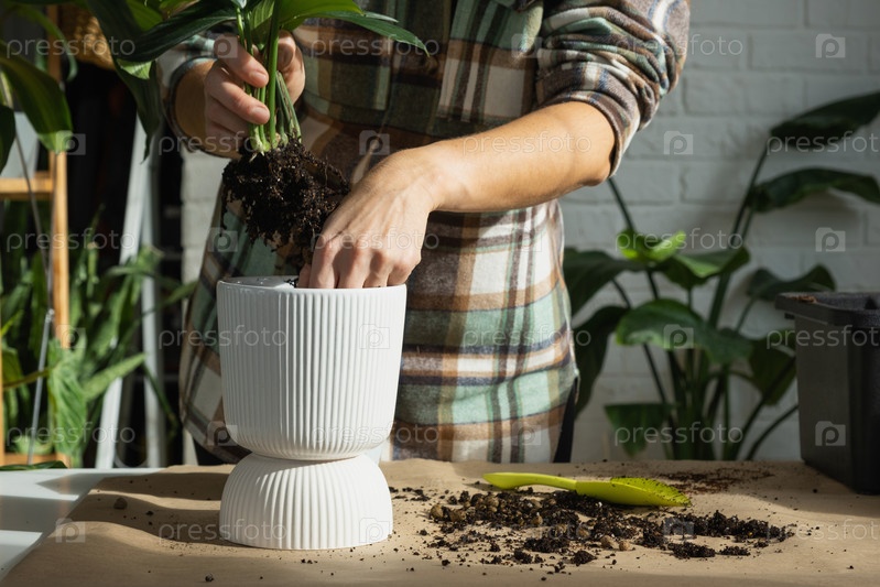 Пересадка домашнего растения Филодендрон Драконий Хвост в новый горшок в интерьере дома. Уход за растением в горшке, руки крупным планом