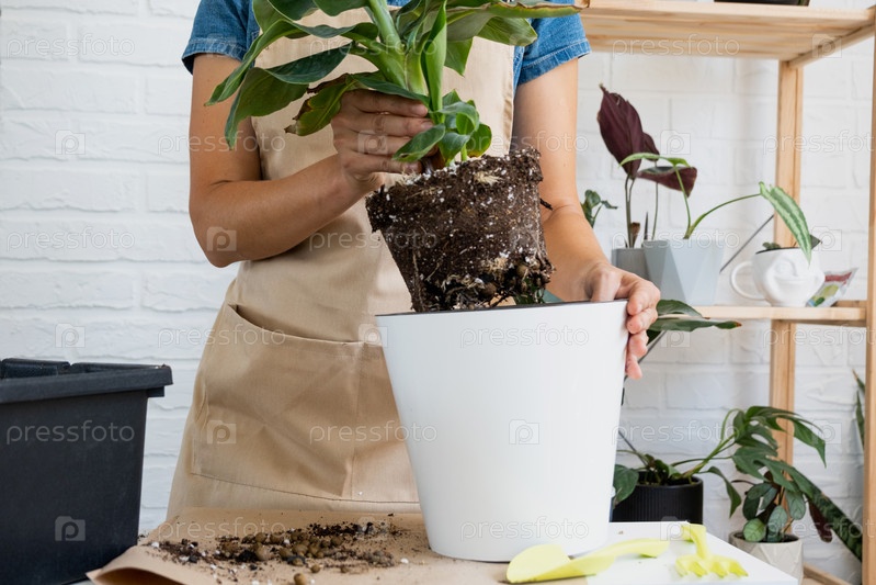 Пересадка домашнего горшечного растения банановая пальма Муса в горшок с автоматическим поливом. Пересадка в новую землю, забота женских рук о тропическом растении, хобби и окружающая среда