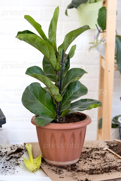 Пересадка домашнего растения Ficus lyrata в новый горшок. Женщина сажает его в новую почву. Уход и размножение растений в горшке, руки крупным планом
