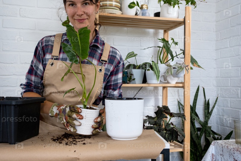 Пересадка домашнего растения Филодендрон в новый горшок. Женщина сажает стебель с корнями в новую почву. Уход и размножение растения в горшке, руки крупным планом
