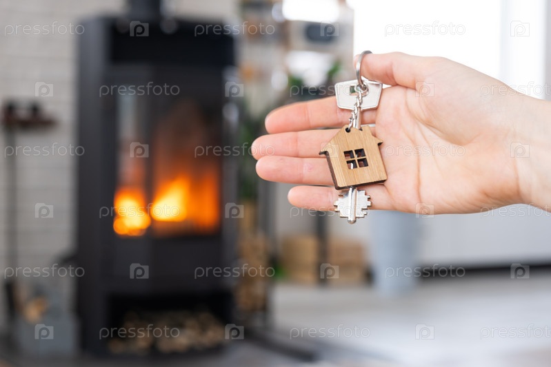 Ключ от дома с брелком в руке владельца против каминной печи с огнем и дровами. Уютный домашний очаг. Строительство, дизайн, проект, переезд в новый дом, ипотека, аренда и покупка недвижимости
