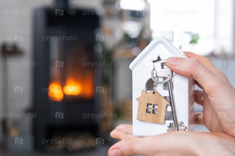Ключ от дома с брелком в руке владельца против каминной печи с огнем и дровами. Уютный домашний очаг. Строительство, дизайн, проект, переезд в новый дом, ипотека, аренда и покупка недвижимости