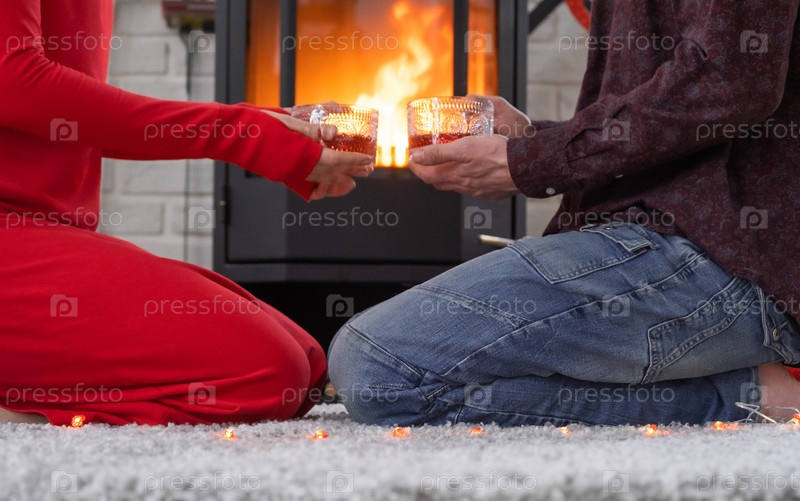 Мужчина и женщина на любовном свидании дома сидят возле каминной печи с горящим огнем на уютном коврике. День святого Валентина, счастливая пара, история любви, отношения