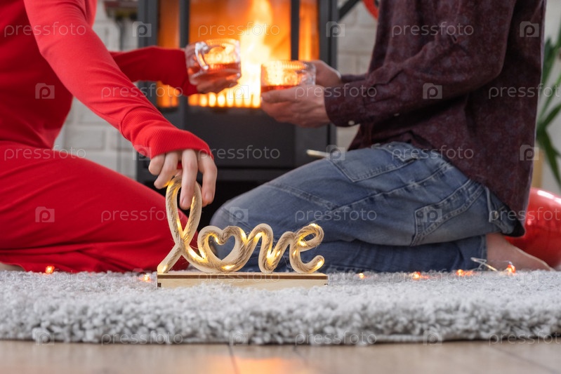 Мужчина и женщина на любовном свидании дома сидят возле каминной печи с горящим огнем на уютном коврике. День святого Валентина, счастливая пара, история любви, отношения