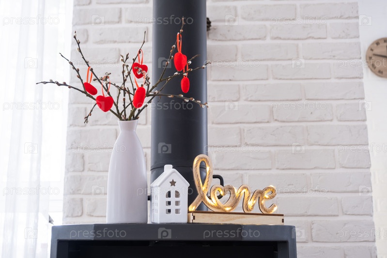 Валентина декор возле каминной печи с огнем и дровами. Уютный домашний очаг в интерьере с горшечными планами, день святого валентина в семейном любовном гнездышке