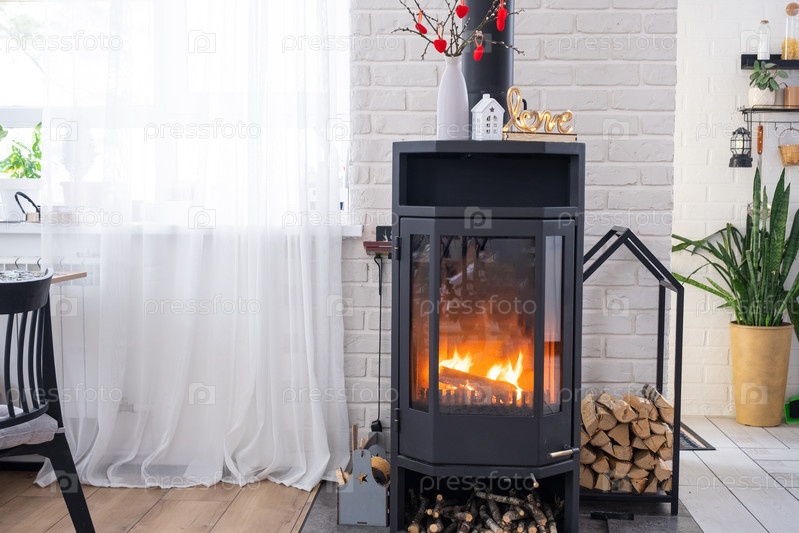Валентина декор возле каминной печи с огнем и дровами. Уютный домашний очаг в интерьере с горшечными планами, день святого валентина в семейном любовном гнездышке