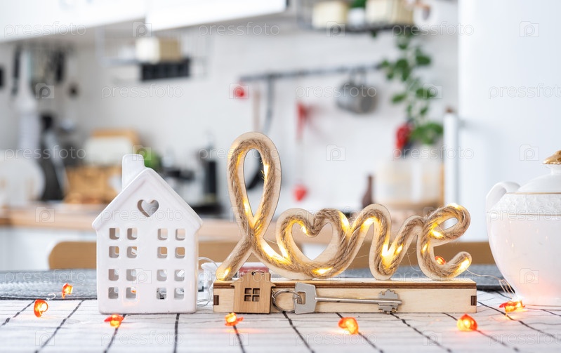 Ключ к дому уютного дома с декором Валентина на кухонном столе. Подарок на день святого валентина, семейное любовное гнездышко. Строительство, дизайн, проект, переезд в новый дом, ипотека, аренда и покупка недвижимости