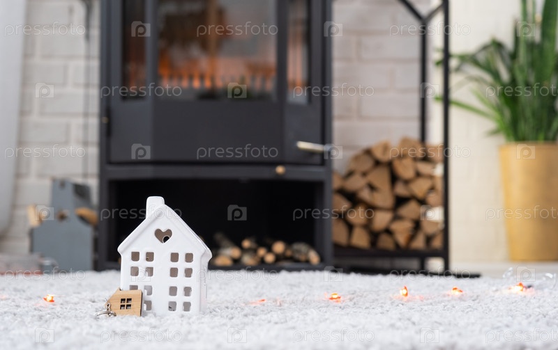 Ключ от дома с брелком на фоне каминной печи с огнем и дровами. Уютный домашний очаг. Строительство, дизайн, проект, переезд в новый дом, ипотека, аренда и покупка недвижимости