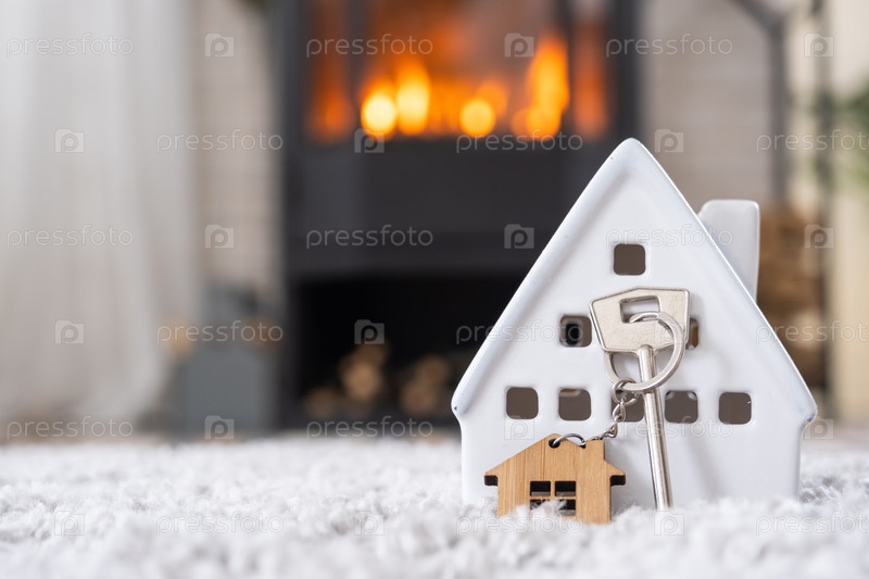 Ключ от дома с брелком на фоне каминной печи с огнем и дровами. Уютный домашний очаг. Строительство, дизайн, проект, переезд в новый дом, ипотека, аренда и покупка недвижимости