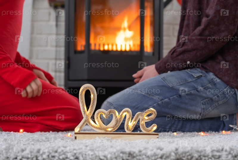Мужчина и женщина на любовном свидании дома сидят возле каминной печи с горящим огнем на уютном коврике. День святого Валентина, счастливая пара, история любви, отношения
