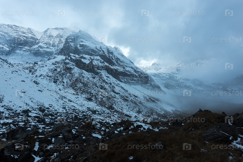 Туманные горы, утро в Гималаях, Непал, заповедник Аннапурна