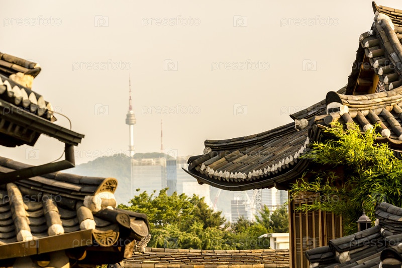 Вид на башню Намсан из деревни Букчон Ханок, Сеул, Южная Корея