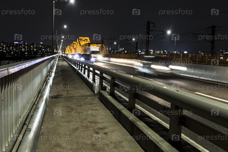 Стальной автомобильный мост ночью. Размытость. Сеульское шоссе ночью, Южная Корея