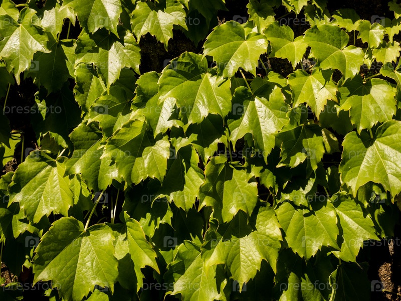 Сочные зеленые листья винограда на каменной стене. Естественный летний фон