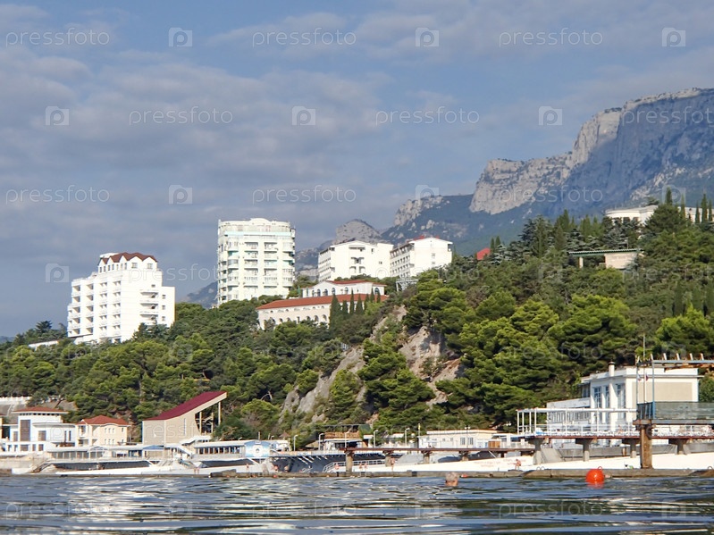 Вид со стороны моря на прибрежную зону, на заднем плане возвышается Ай-Петри. Южный берег Крыма, Гаспра