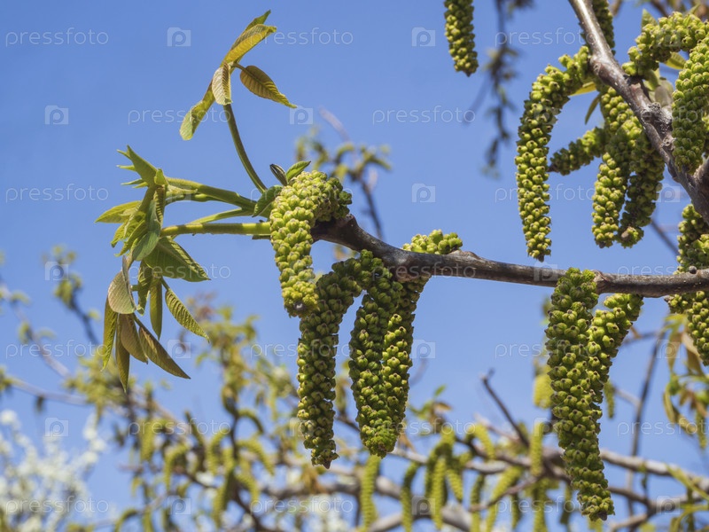Цветки грецкого ореха. Грецкий орех Juglans regia Catkins Цветы на дереве Крупный план макро-детали цветущие весенние зеленые листья растений против неба в саду. Цветущий грецкий орех весной, сельское хозяйство