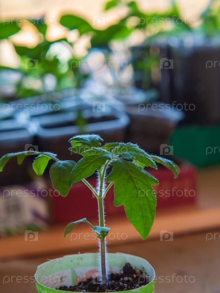 Рассада томатов в специальных горшках с размытыми краями. Выращивание рассады овощей в домашних условиях. Крупный план ростка зеленого помидора. Эко-продукты