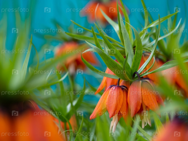 Оранжевые цветы Fritillaria Imperialis в весеннем саду. Императорский тетерев или цвета короны кайзера. Красивая весенне-летняя открытка или обои. Цветочный фон