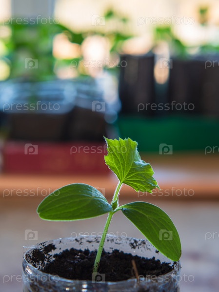 Росток огурца в чашке на фоне подоконника с ящиками для рассады. Выращивание экологически чистых натуральных продуктов. Зеленая рассада огурца крупным планом с местом для текста