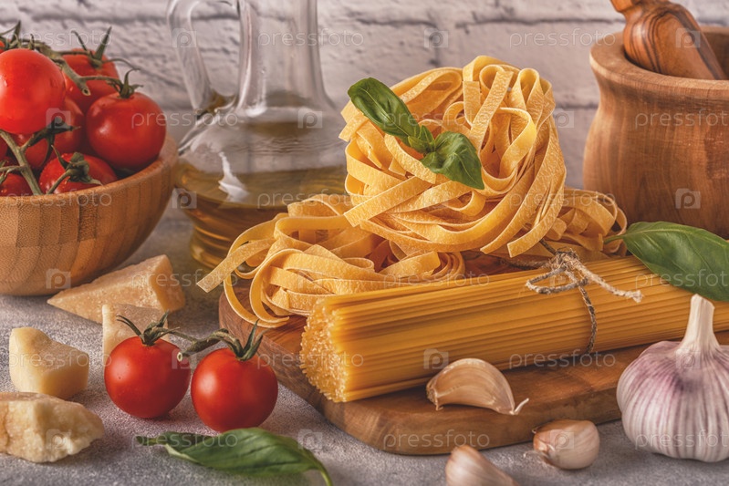 Продукты для приготовления - макароны, помидоры, чеснок, оливковое масло, базилик