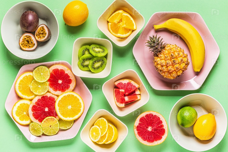 Тропические фрукты целиком и кусочки на тарелках